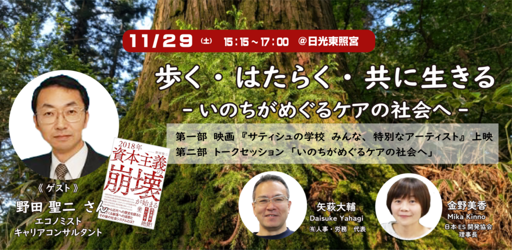 「太陽のもとのてらこや」ゴール地・日光東照宮で開催するこの講演では、労働者協同組合(ワーカーズコープ)連合会 田嶋さんをゲストにお迎えし、2020年法制化で新たな一歩を踏み出した「協同労働という働き方・組織のかたち」の視点から、これからの新たな社会のあり方について考えます。